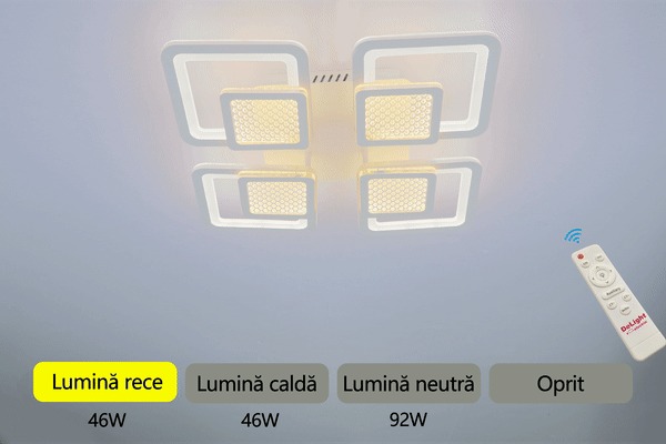 Lustra Led vine cu telecomanda din care se poate regla culoarea luminii (alb cald, alb neutru si alb rece) cat si intensitatea acesteia.