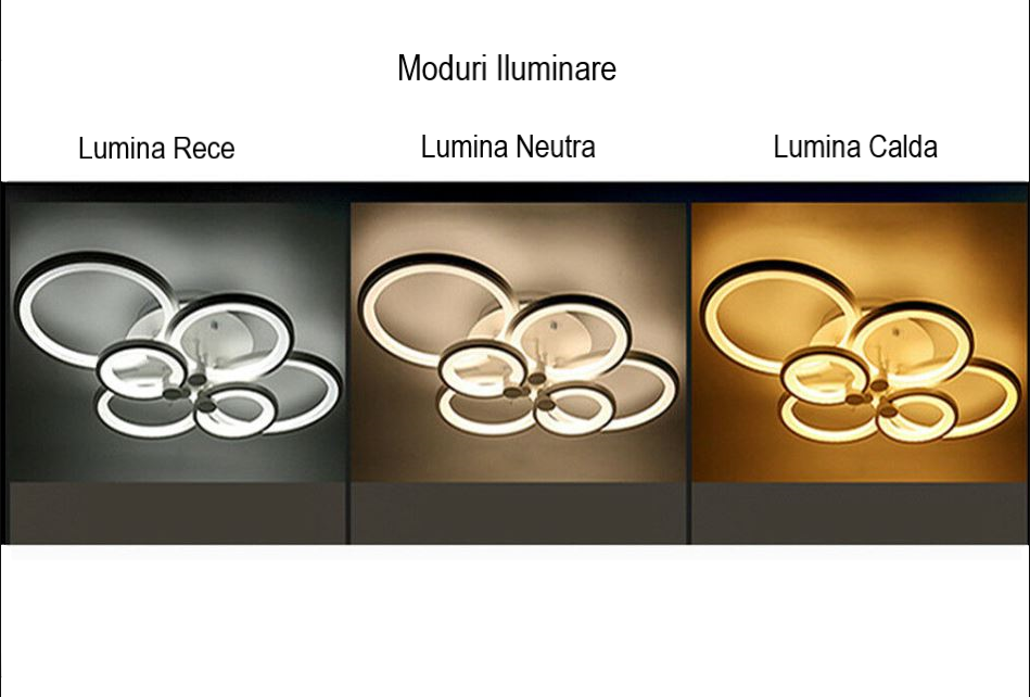 Lustra Led vine cu telecomanda din care se poate regla culoarea luminii (alb cald, alb neutru si alb rece) cat si intensitatea acesteia.